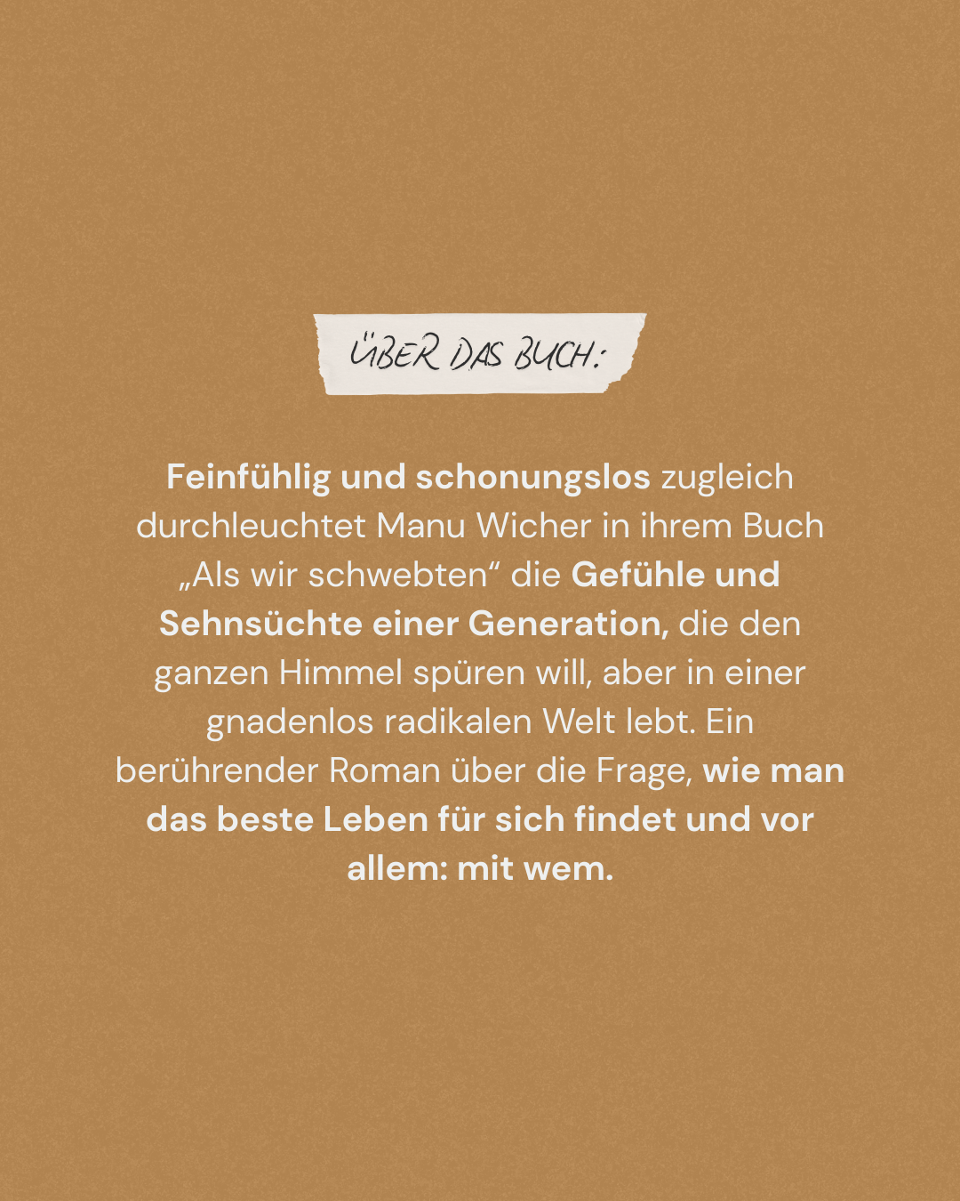Am 19. August 2025, ab 18 Uhr liest Manu Wicher auf der Dachterrasse des Restaurant PEBERG aus ihrem berührenden Roman „Als wir schwebten“ – eine feinfühlige Erzählung über die Frage, wie man das beste Leben für sich findet und vor allem: mit wem.