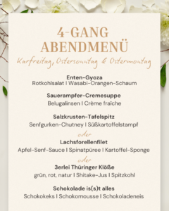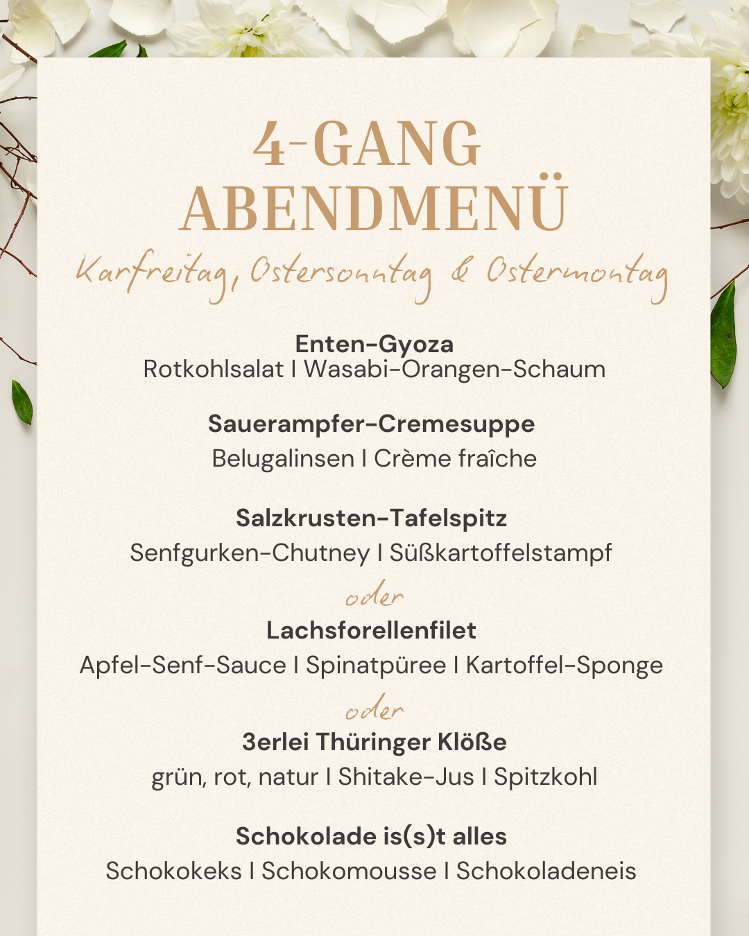 Mittags servieren wir euch ein 3-Gang-Menü, am Abend ein 4-Gang-Menü mit frühlingshaften Aromen und feinen Kompositionen.